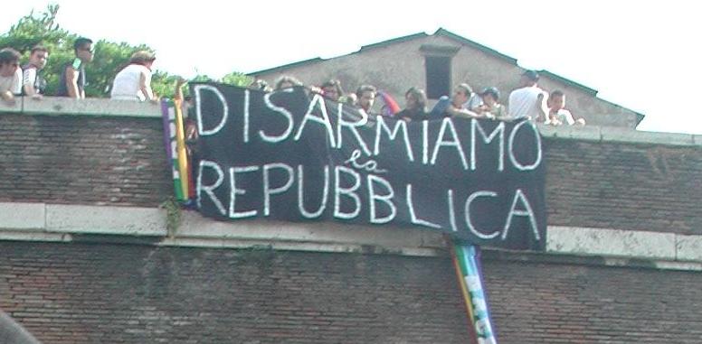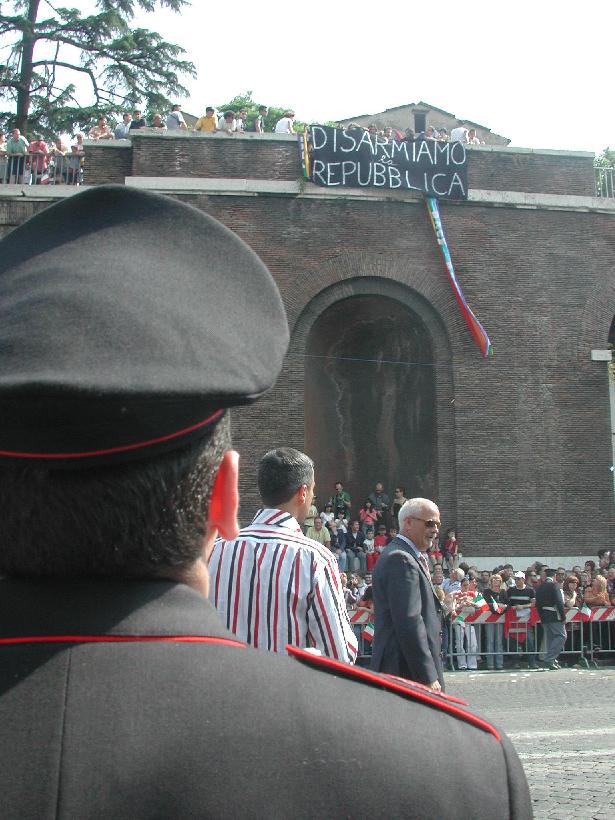 Roma, 2 giugno 2003 - Uno striscione con la scritta "Disarmiamo la Repubblica" è stato aperto da un gruppo di cittadini nonviolenti (il "Gruppo di Azione Nonviolenta") ed esposto dal belvedere "Antonio Cederna", che si affaccia su via dei Fori Imperiali, all'inizio della parata militare. Dalla terrazza sono anche stati lanciati volantini con scritto: "No all'invio di soldati in Iraq" e sono state sventolate diverse bandiere arcobaleno con la scritta Pace. All'arrivo delle forze dell'ordine non è stata opposta nessuna resistenza, ma sono state loro offerte delle bombe alla crema: "l'unica bomba che ci piace". Del gruppo di manifestanti ne sono stati fermati dieci, condotti al Commissariato di Polizia del Celio, e rilasciati a fine mattinata dopo essere stati identificati e aver ricevuto notifica che nei loro confronti sarà trasmessa all'Autorità Giudiziaria la comunicazione di reato per manifestazione non autorizzata. Lo striscione è stato sequestrato.