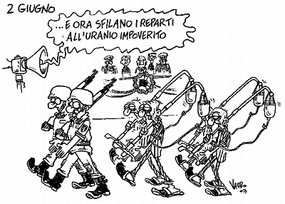 Il fatto che quest'anno, per la prima volta, abbiano sfilato durante la parata militare (che tale rimane) anche quattro giovani del Servizio Civile, è a nostro avviso un elemento di ulteriore aggravante: non si tratta, come sostengono alcuni Enti di Servizio Civile, di un riconoscimento a tale settore, ma al contrario di un totale svilimento di quelle che sono le radici culturali, politiche e sociali del servizio civile. Questa novità, nata su proposta dal ministro Giovanardi, è quindi una scelta che ci umilia e ci offende, e rappresenta un ulteriore segno di quella militarizzazione della società civile che da anni viene attuata tramite tanti provvedimenti fatti passare sotto silenzio, per esempio quello che riserva posti di lavoro nell'amministrazione pubblica ai militari volontari reduci dal periodo di ferma nelle Forze Armate. Esprimiamo la nostra più ferma distanza e disapprovazione verso la scelta di Sara, Francesca, Silvia e Claudia, volontarie dell'associazione "Il nostro futuro" di Palestrina (Roma), che hanno sfilato insieme a 731 ufficiali, 1.073 sottufficiali, 5.655 militari di truppa, 379 uomini a cavallo, 197 mezzi militari, 28 aerei e 35 elicotteri. Contente loro...